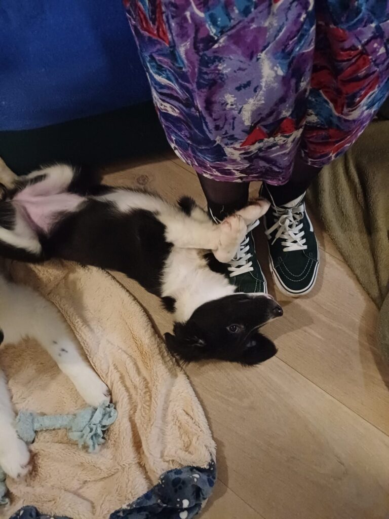 Aan de lijn lopen doe ik al best goed. Het veiligheidstuigje omdoen vind ik nog een beetje spannend, maar zodra het eenmaal aan is en de lijn vastzit, is het helemaal oké. Ik ben nog niet helemaal zindelijk, maar ik doe mijn plasjes netjes op de puppy pads. Met geduld, liefde en begeleiding gaat dat zeker goed komen.