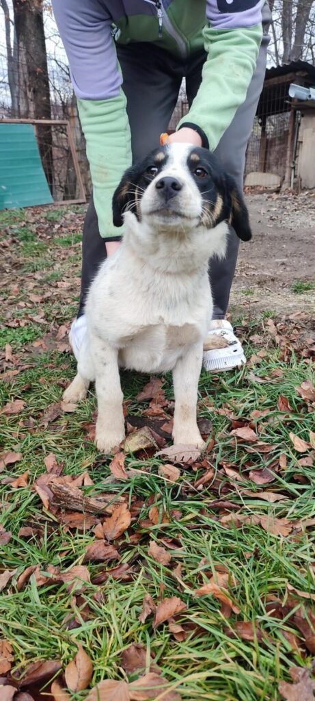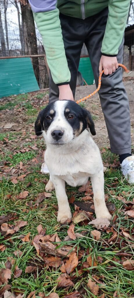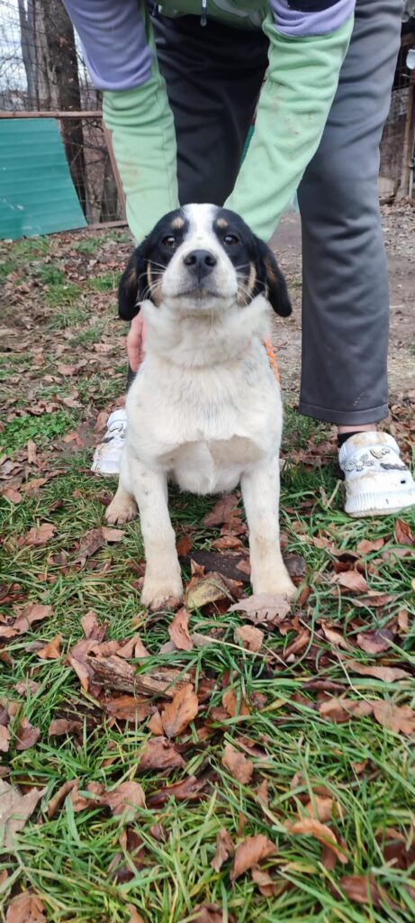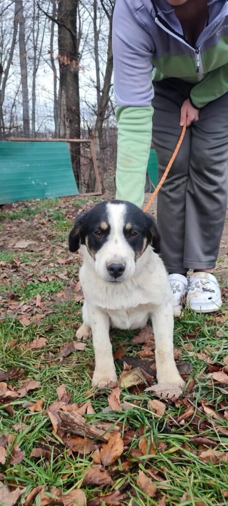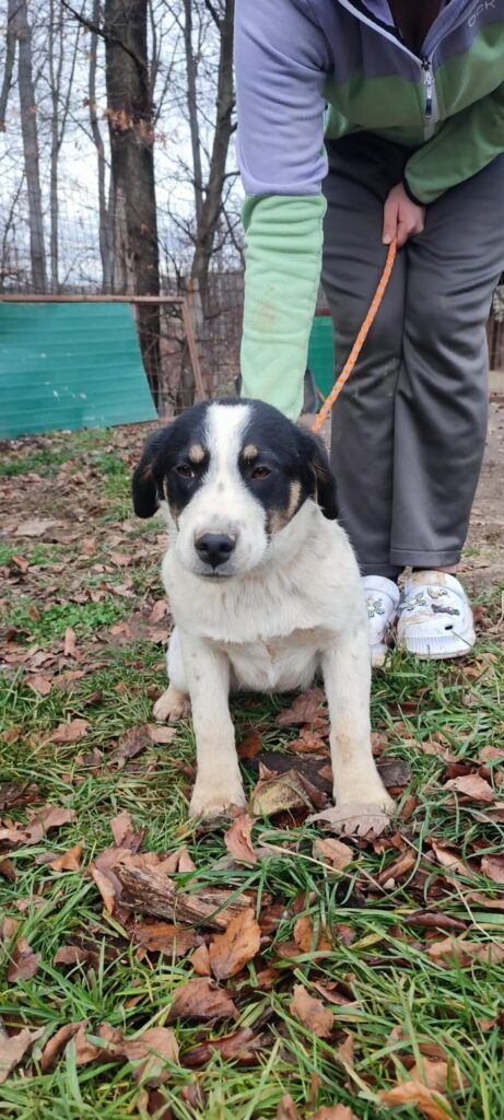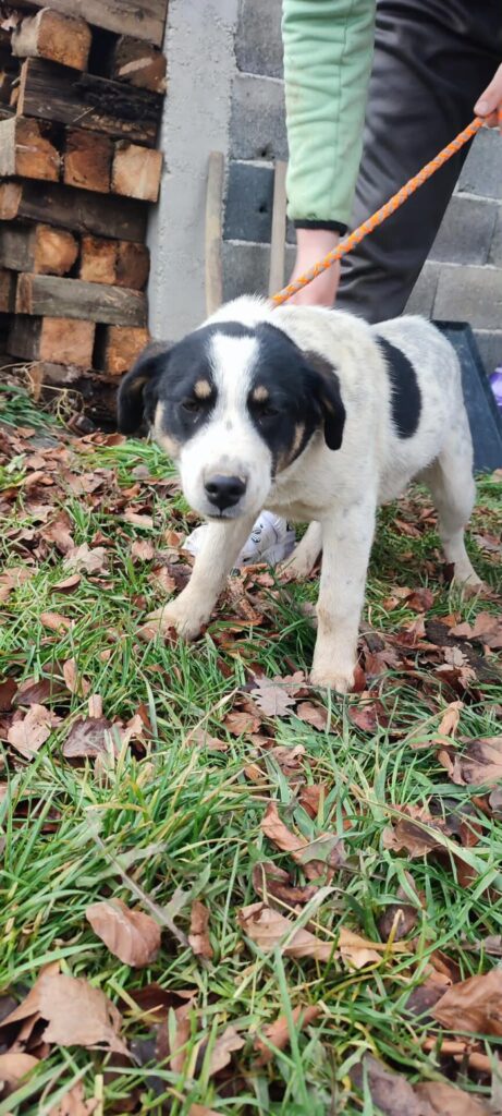 Omdat hij tot voor kort vrij leefde, zie je op foto’s dat hij soms wat verbaasd of “geschrokken” kijkt — hij staat namelijk pas sinds kort aan een riem — maar hij doet het heel goed en is een puppy die snel leert en enorm zijn best doet.