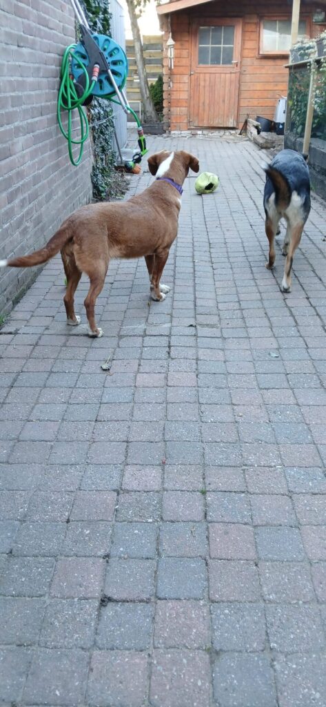 Aan de riem lopen moet ze nog leren, maar stap voor stap gaat dit beter. Loslopen zal misschien nooit lukken, maar ze geniet volop van speel- en wandelmomenten, bijvoorbeeld in een loslooppark samen met andere honden.