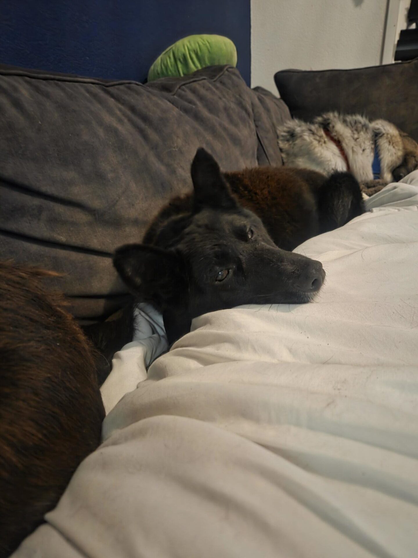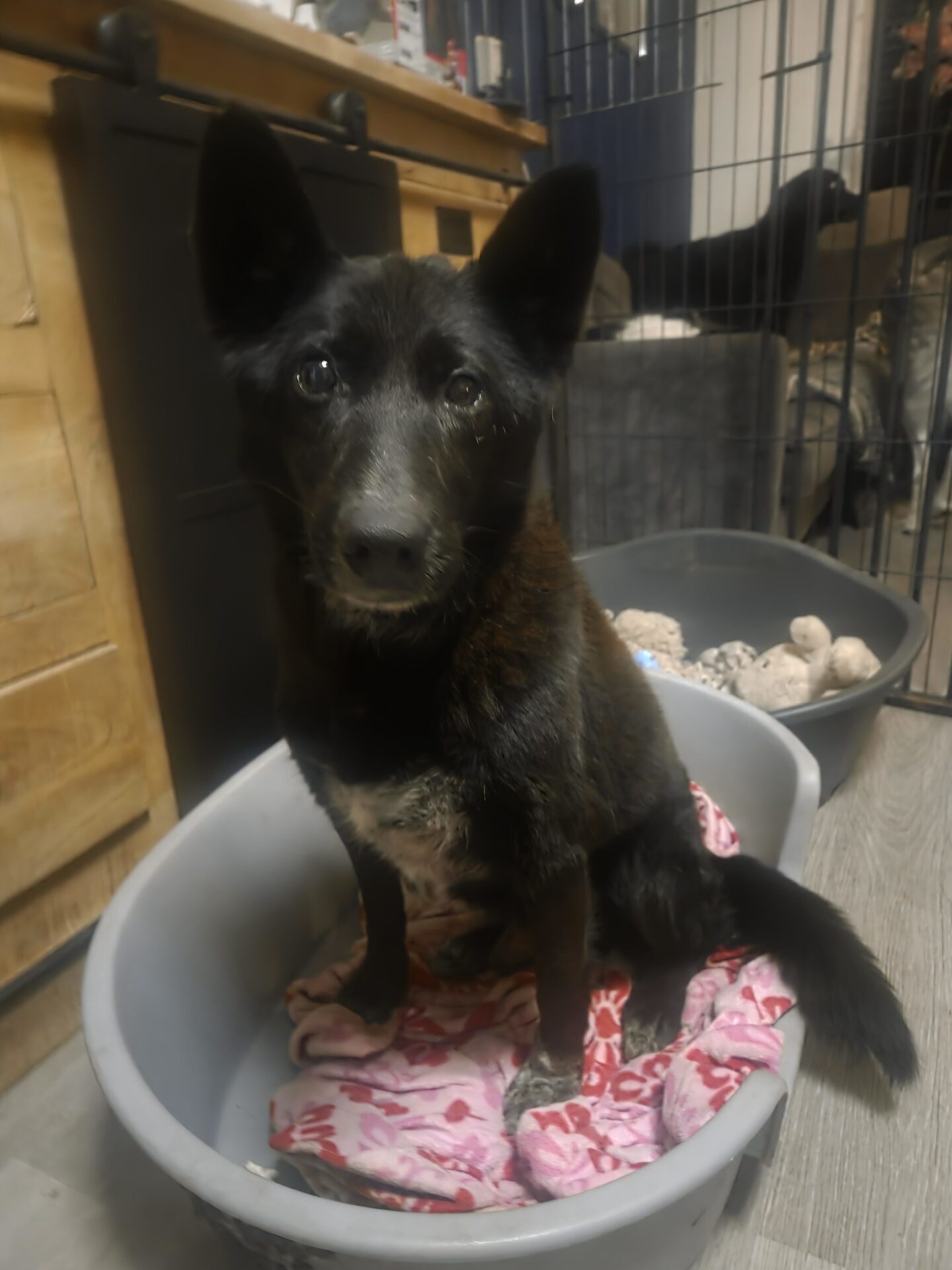 Vandaag is Floki volledig doof en ziet hij nog maar weinig. Daardoor kan hij, wanneer hij in zijn slaap schrikt van een onverwachte aanraking, uit reflex reageren. Om die reden zoeken we voor hem een rustig thuis zonder kinderen. Geen drukte, geen plotselinge prikkels — alleen voorspelbaarheid en zachte handen.
