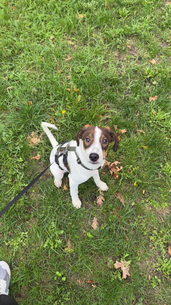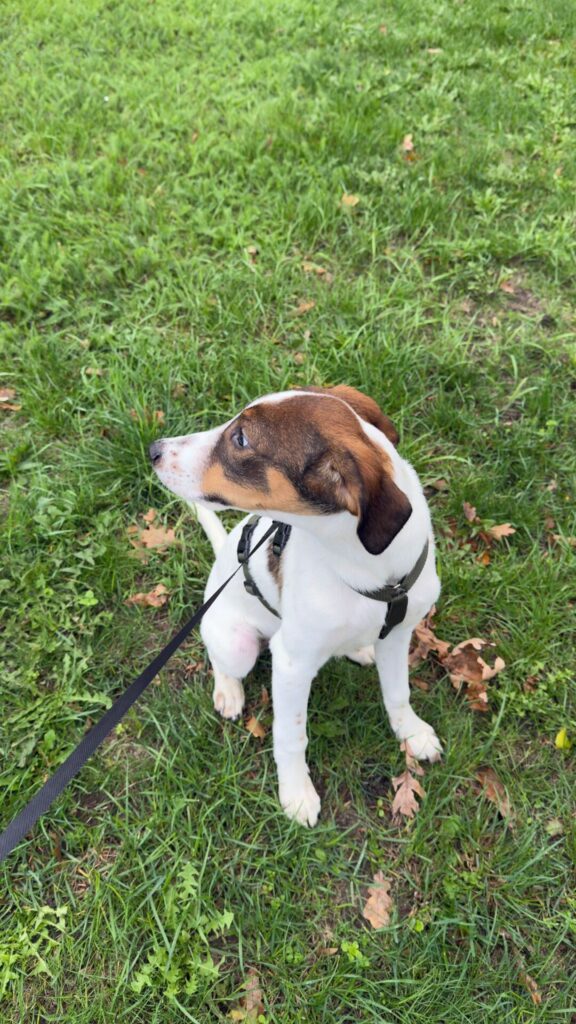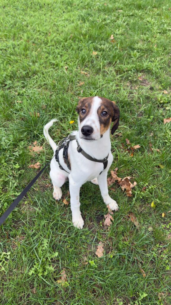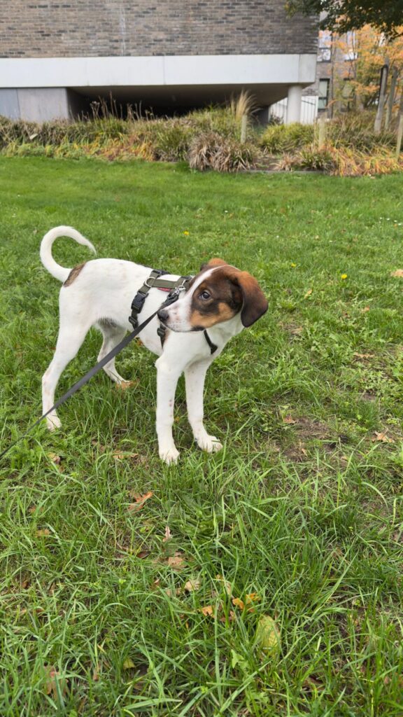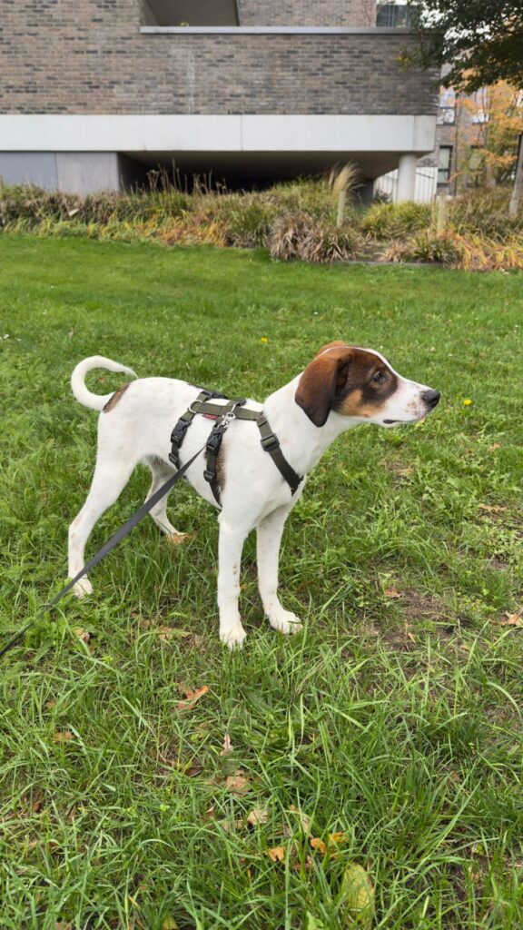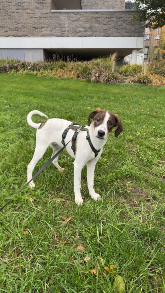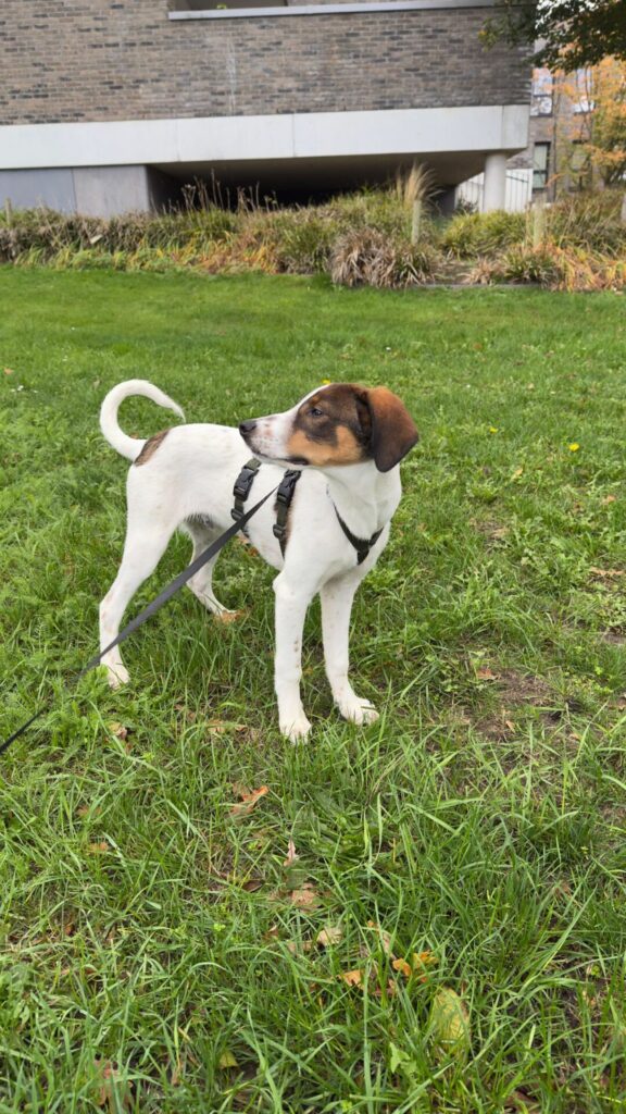 Hij is sociaal, kan goed met andere honden (katten zijn nog onbekend), en leert stap voor stap de basiscommando’s – al heeft hij soms nog iets beters te doen dan luisteren .