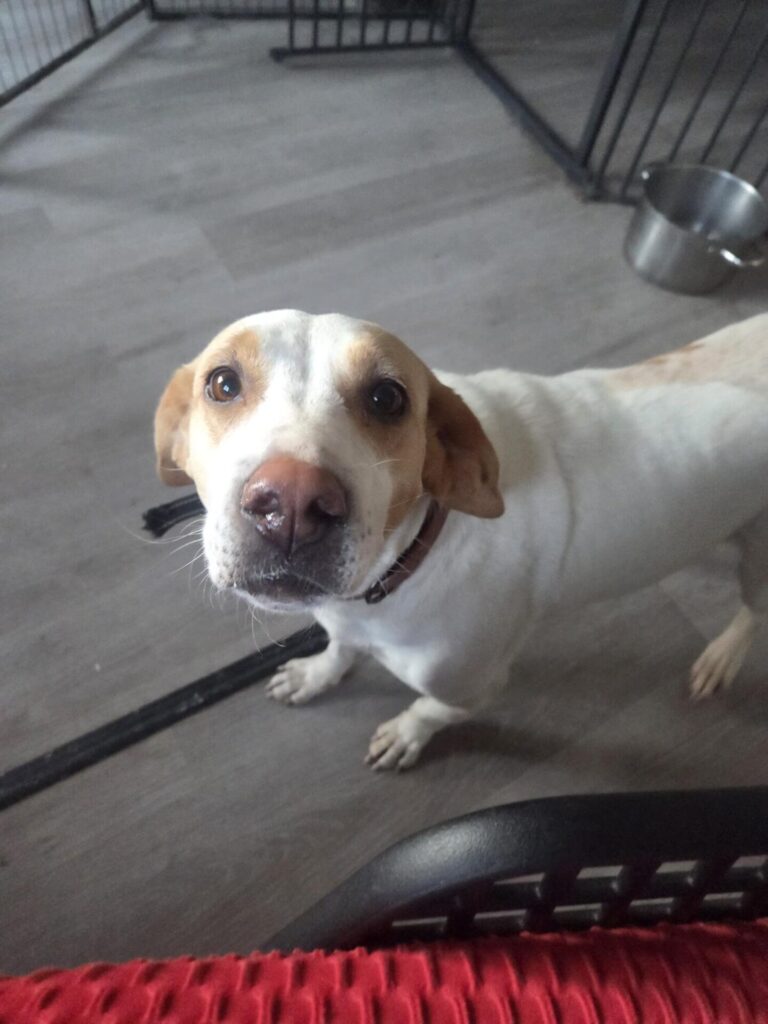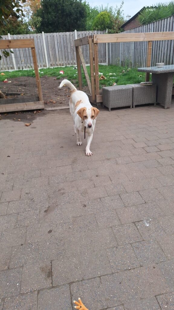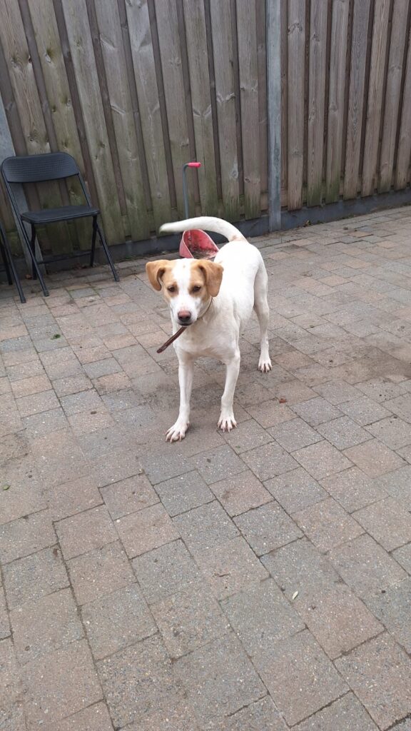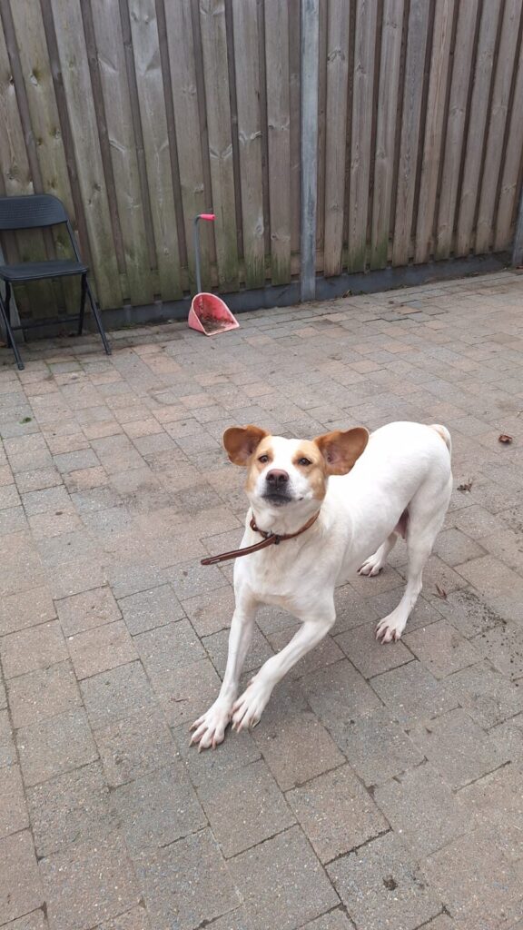Ze is ongeveer 50 cm hoog, weegt nu rond de 25 kilo maar zal straks uitgroeien tot zo’n 18 à 20 kilo (slanker postuur). Op dit moment is ze nog aan het herstellen van haar operatie, maar dat gaat heel goed.