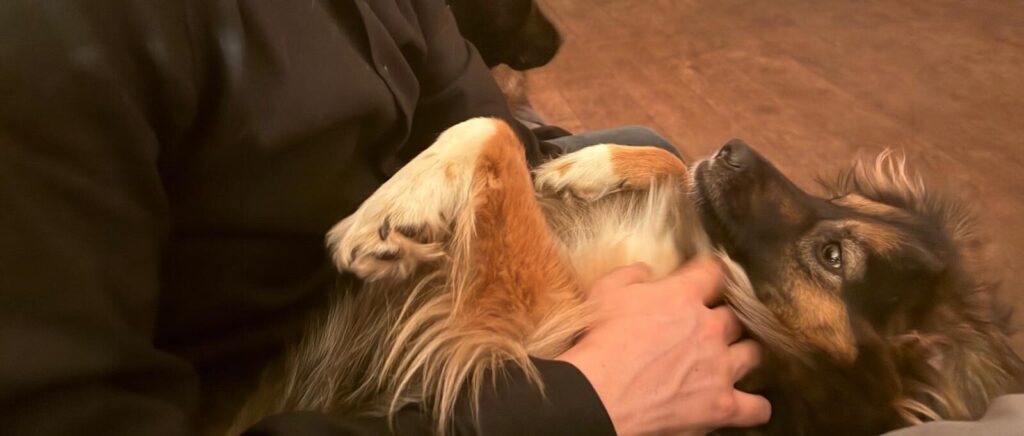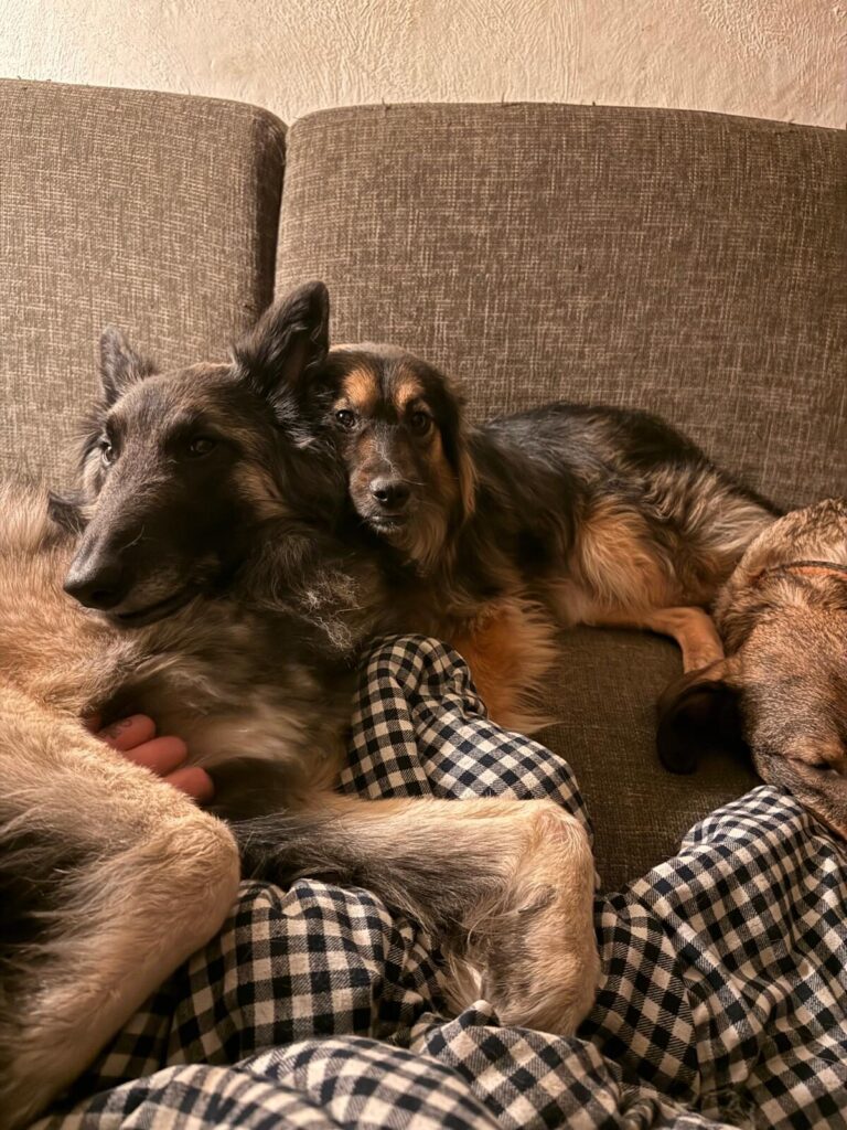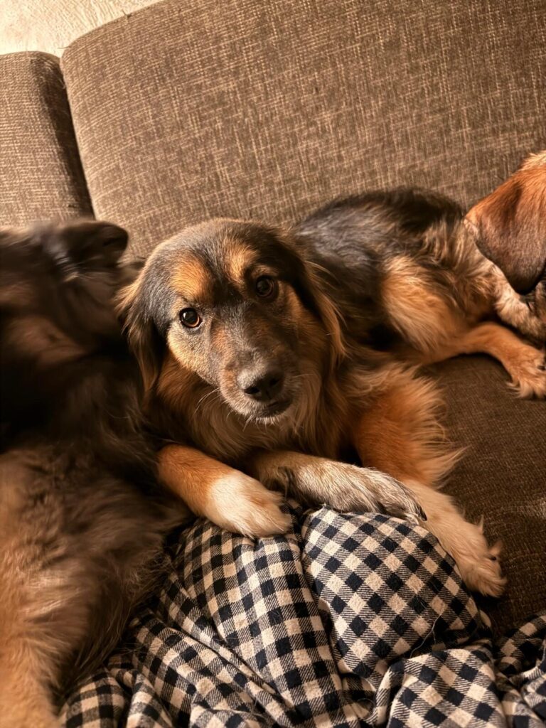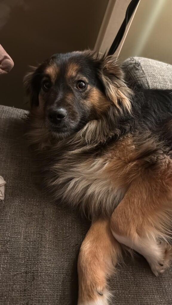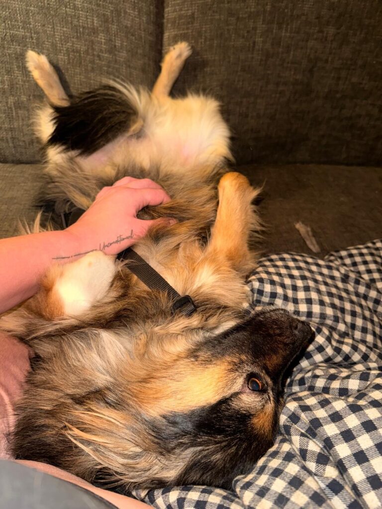 Na een paar weken zie je al een groot verschil. De spanning ebt weg en er verschijnt een heel ander hondje. Molly loopt je achterna, reageert enthousiast op “Molly, kom”, springt zelf op de bank en zoekt actief contact. Ze komt tegen je aan liggen, legt een poot op je arm of rug en geniet zichtbaar van kriebels en belly rubs 🤍