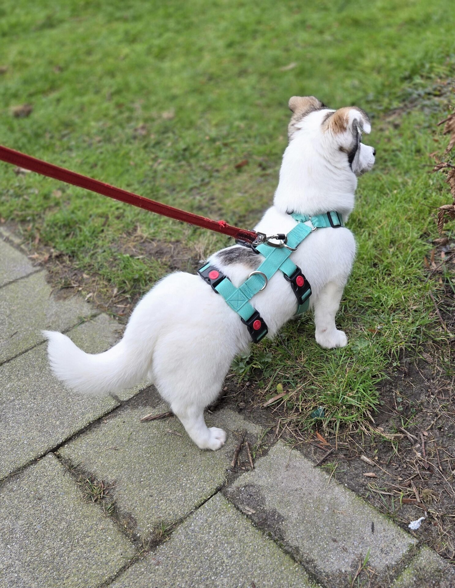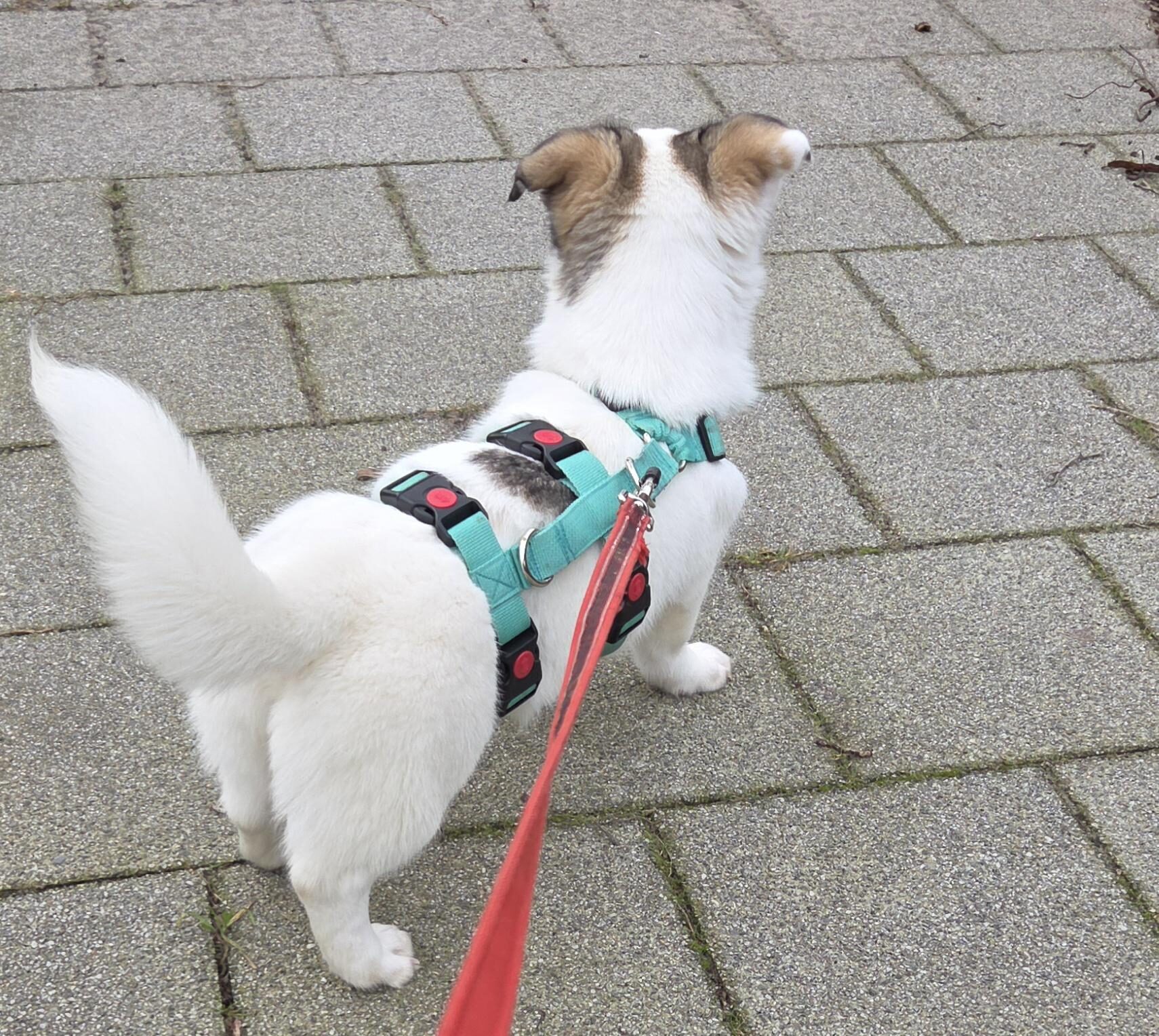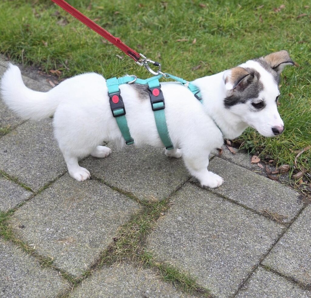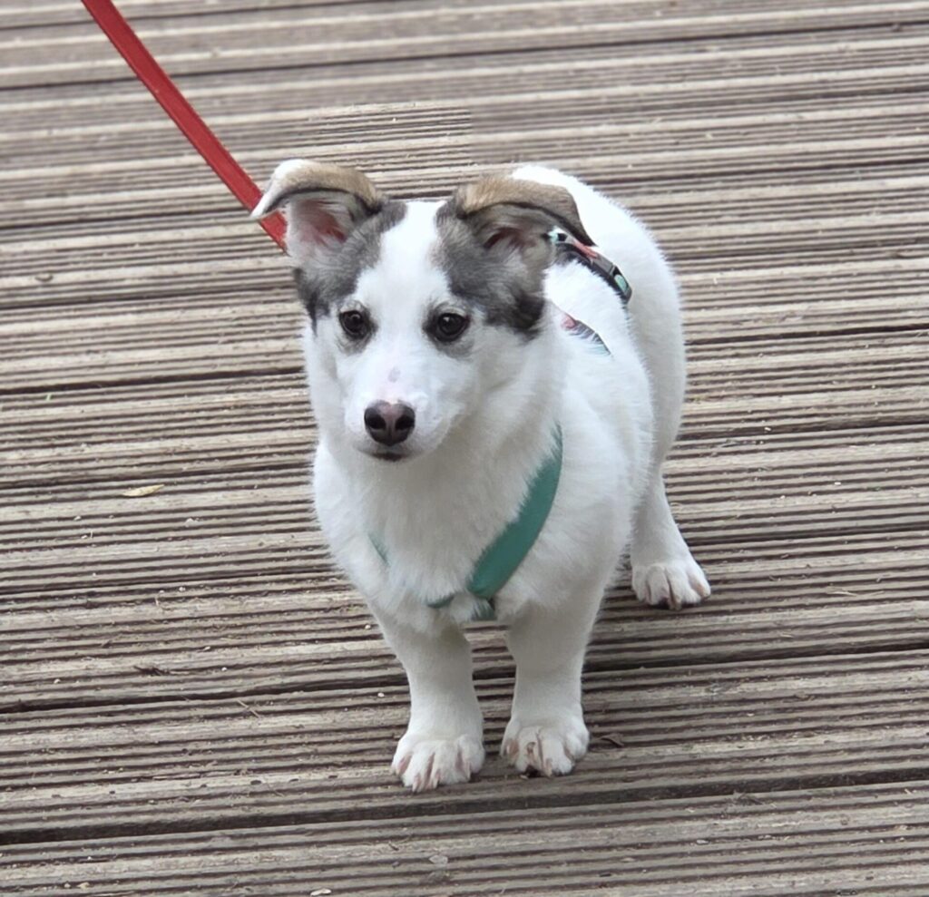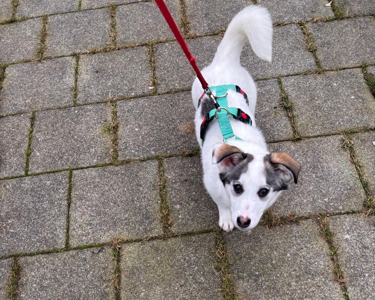 Stella is een pupje met een overwegend witte vacht en zachte lichtgrijze tinten rond haar oortjes. Ze is een rustige ontdekker: niet de drukste van het stel, maar wel alert en nieuwsgierig. Met haar grote ogen volgt ze alles wat om haar heen gebeurt, steeds een beetje dapperder, steeds een beetje zekerder.