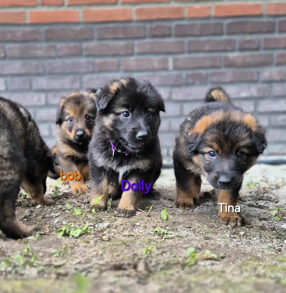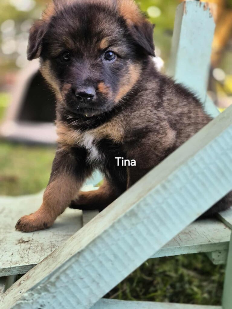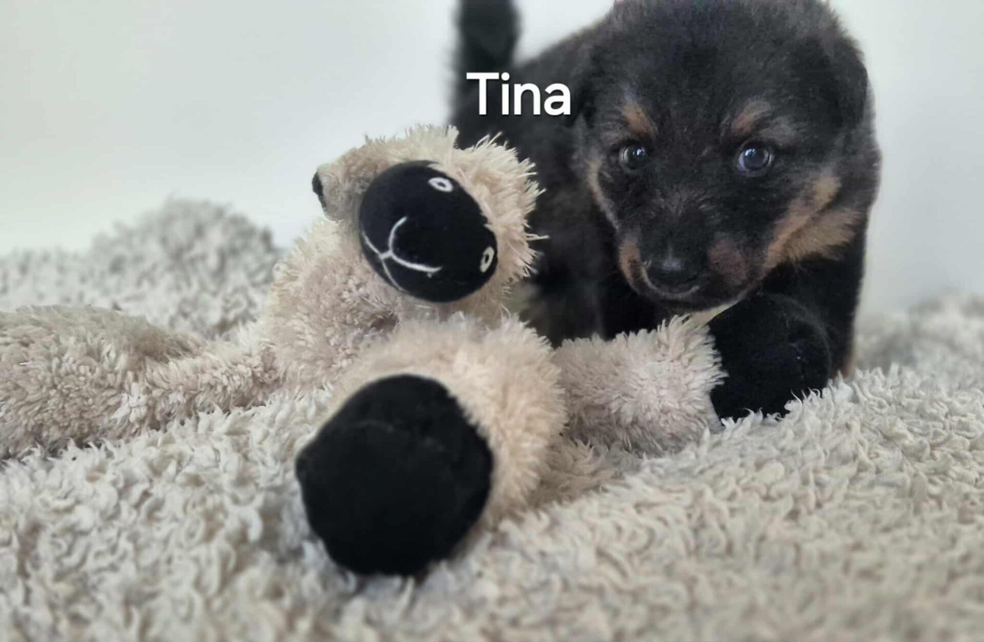 Tina is de meest aanwezige teef van het nest. Ze speelt en stoeit graag en laat zich duidelijk horen. Ze geniet ervan om opgetild te worden en knuffelt graag, terwijl ze alert blijft op wat anderen doen.